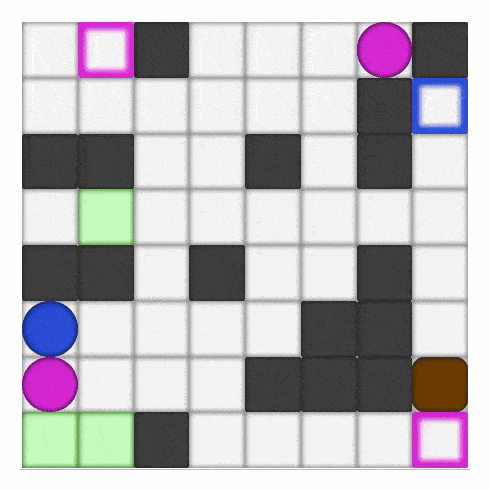 In later levels, there are also special fields and multiple movable objects, with the gimmick that they all move at the same time. As a result, your single action moves all movable elements in the same direction (as in the popular 2048 game)