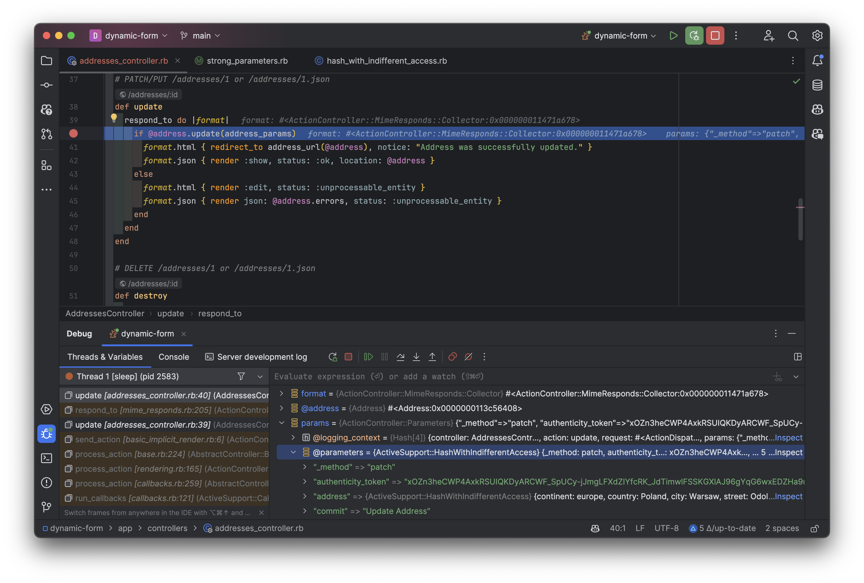 The screenshot shows a RubyMine IDE during a debugging session for an update method in an AddressesController, with a breakpoint set (red dot left to the code) and variables displayed in the debugging panel below the code.